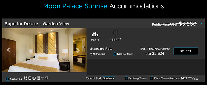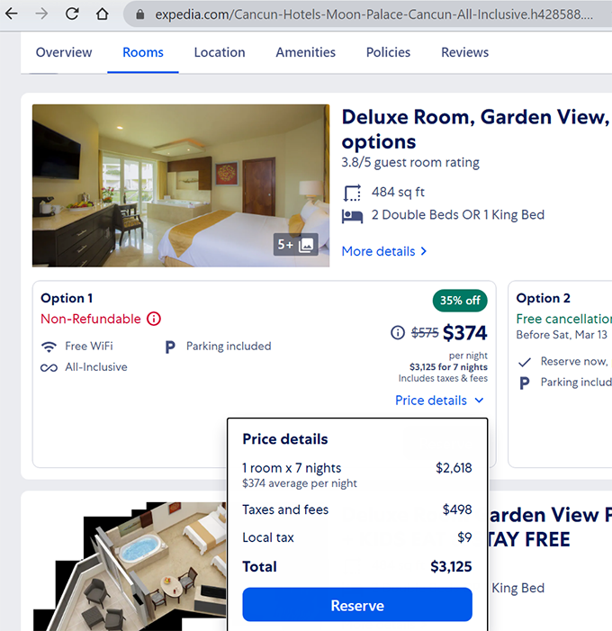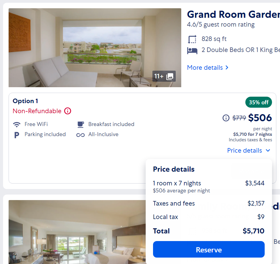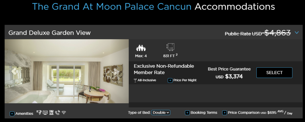 Как я уже говорил, основной клубный бонус это 20% скидка от цены на expedia. Пример: Весенние каникулы. Неделя с 3 по 10 апреля 2021. Двое взрослых и двое детей. Nizuc/Sunrise. Самая дешевая опция Deluxe Room, Garden View. Expedia: $3125