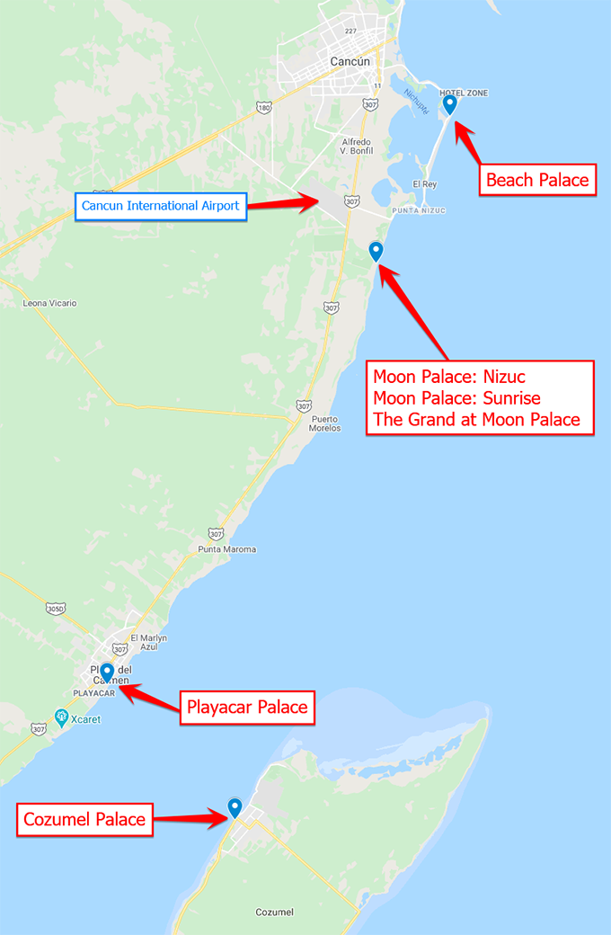 Остальные три отеля (Nizuc, Sunrise и The Grand) находятся рядом друг с другом в лагуне под Канкуном. Вся тройка отелей имеет общее название Moon Palace. Несмотря на то, что каждый из этих трёх отелей технически независим и имеет своё лобби, свои рестораны, свои бассейны, пляжи, вечерние представления, детские комнаты и прочие развлекухи, отели находятся рядом друг с другом имеют общую территорию.