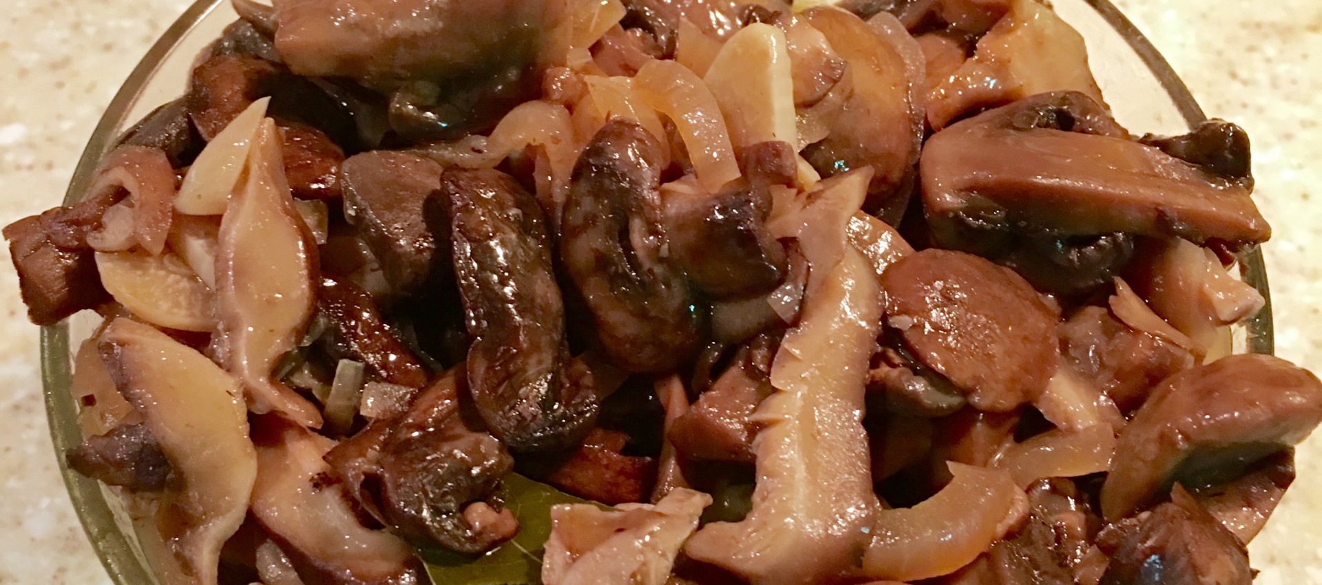 Тщательно промойте шампиньоны в теплой воде от загрязнений, откиньте на дуршлаг, чтобы лишняя вода стекла, и высыпьте их на хорошо разогретую сухую сковороду на 7 минут, периодически помешивая. Marinovannie-shampinjoni2Пока грибы дают сок на сковороде, в стеклянной или фарфоровой миске смешайте ингредиенты маринада: растительное масло, соль, сахар, лавровый лист, душистый перец и уксус.