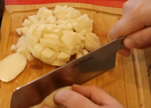 - Морковка и картошка нарезается кубиками. Лук режется мелко.