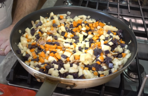 - Обжарить лук до прозрачности, закинуть картошку и морковку. Обжарить.