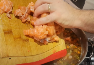 - Нарезать рыбу кубиками.